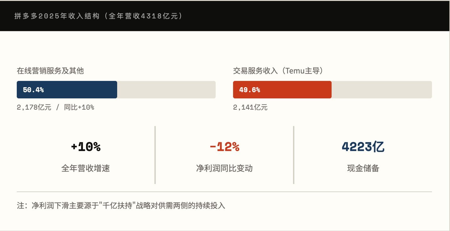 去年4月推出的千亿扶持,本质是守势。减佣金、送流量、降费用,说白了是平台拿钱稳商家信心。代价已经在财报上体现出来了,2025全年营收增速降至10%,净利润同比下降12%。